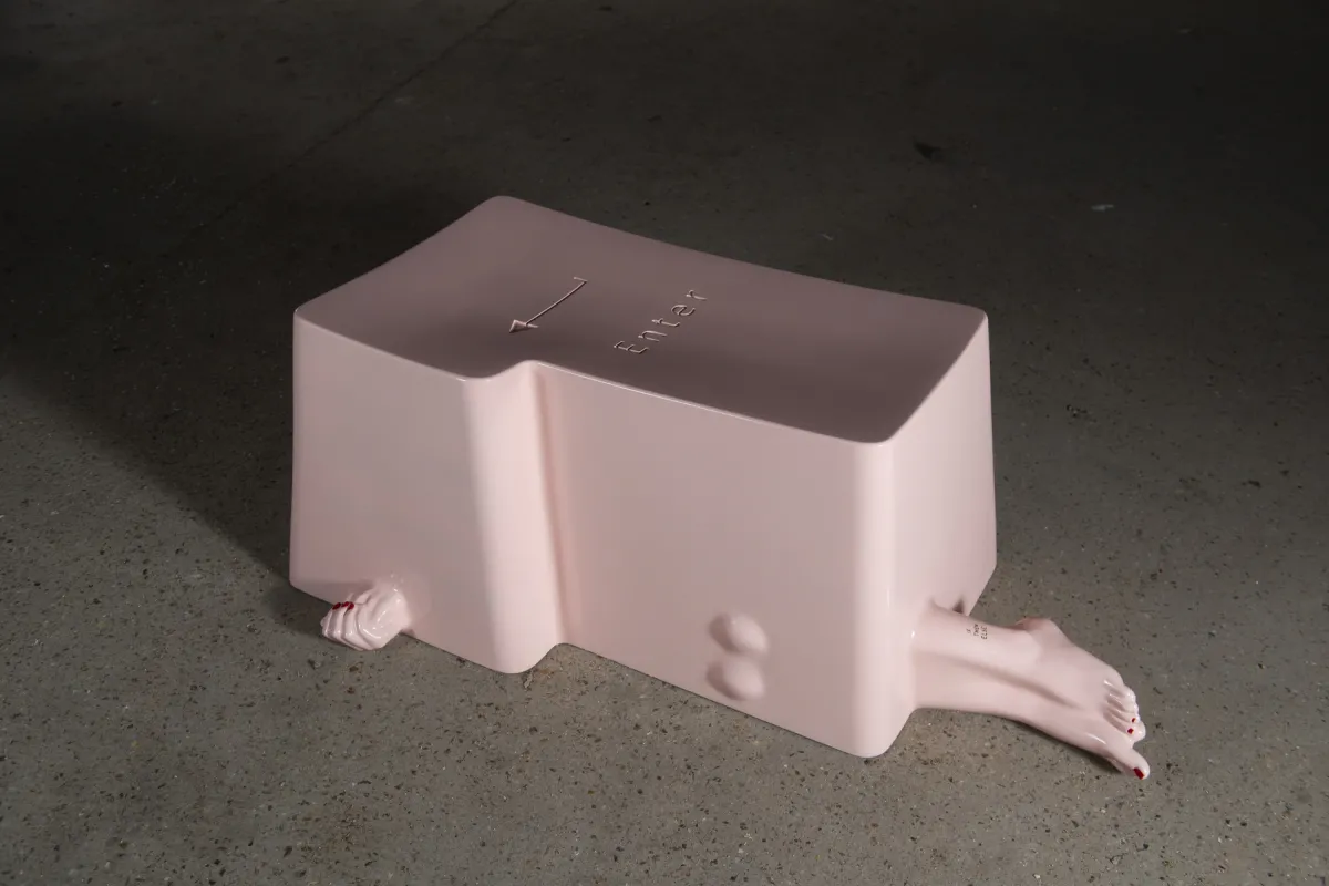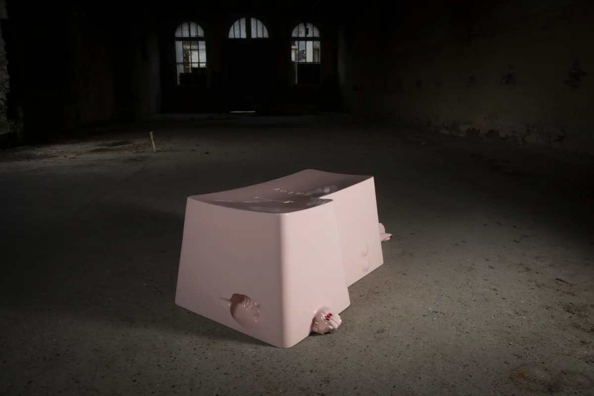 Description: A sculpture that forms a two person seat with a being who is appearing, or disappearing? An aporia in my opinion. For as long as man has existed, this is the first time that all human knowledge has been centralized in a single entity, AI. The issue is not the disappearance of Man, but the loss of psychomotor and mental functions, and loss of autonomy.