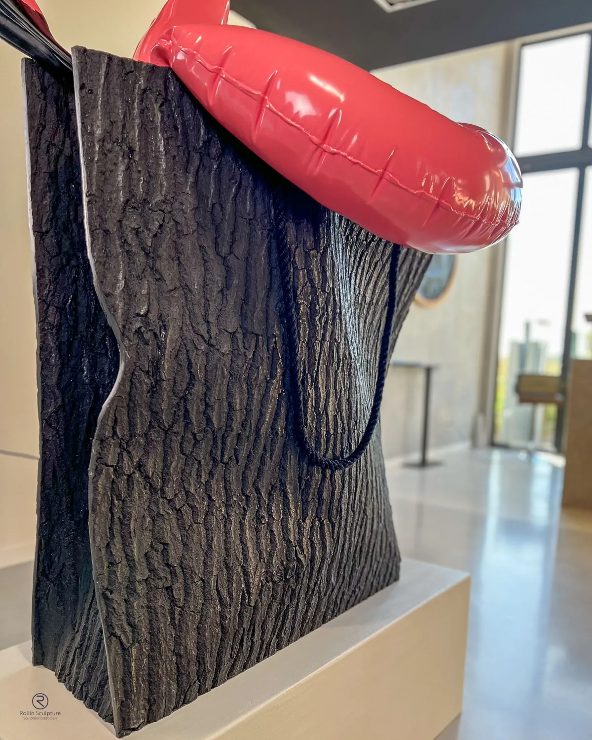 A bag made of tree bark, reflecting a society that will exploit every last resource.