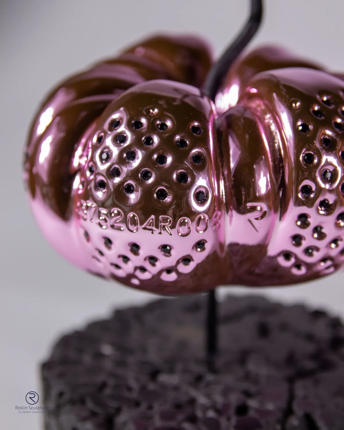 Description: A tomato with the texture of a strawberry resting on a substrate closer to asphalt than earth, and topped with a stem degeneration. Straight out of a marketing department, from a slightly mad society craving novelty and need to control everything, including the natural world. The numbering on the piece reflects the notion of industrial property